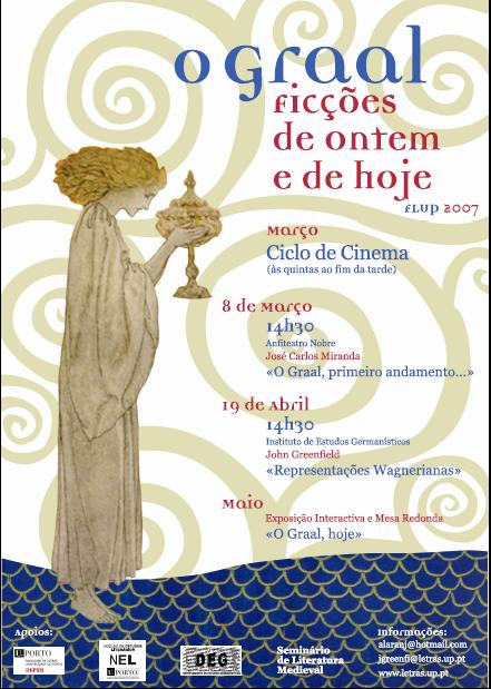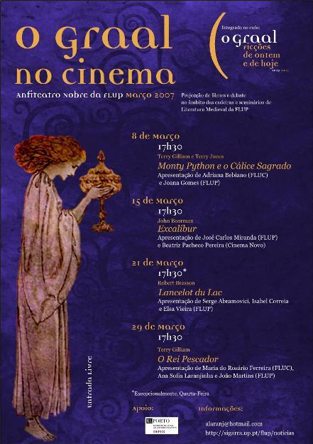 Com o ciclo O Graal ? ficções de ontem e de hoje pretendemos abrir a discussão sobre este mito a todos os potenciais interessados. Em Março, José Carlos Miranda será o nosso guia pelos caminhos da Literatura Medieval; em Abril, John Greenfield falar-nos-á sobre as representações wagnerianas do tema; em Maio, organizaremos uma Mesa Redonda para reflectir sobre o Graal, hoje - mote para a exposição que estará patente, também nesse mês, na Biblioteca Central. O ciclo de cinema que decorrerá durante o mês de Março (às Quintas-feiras, ao fim da tarde) trará à FLUP medievalistas e cinéfilos cujas intervenções suscitarão - assim o esperamos - a reflexão e o debate.