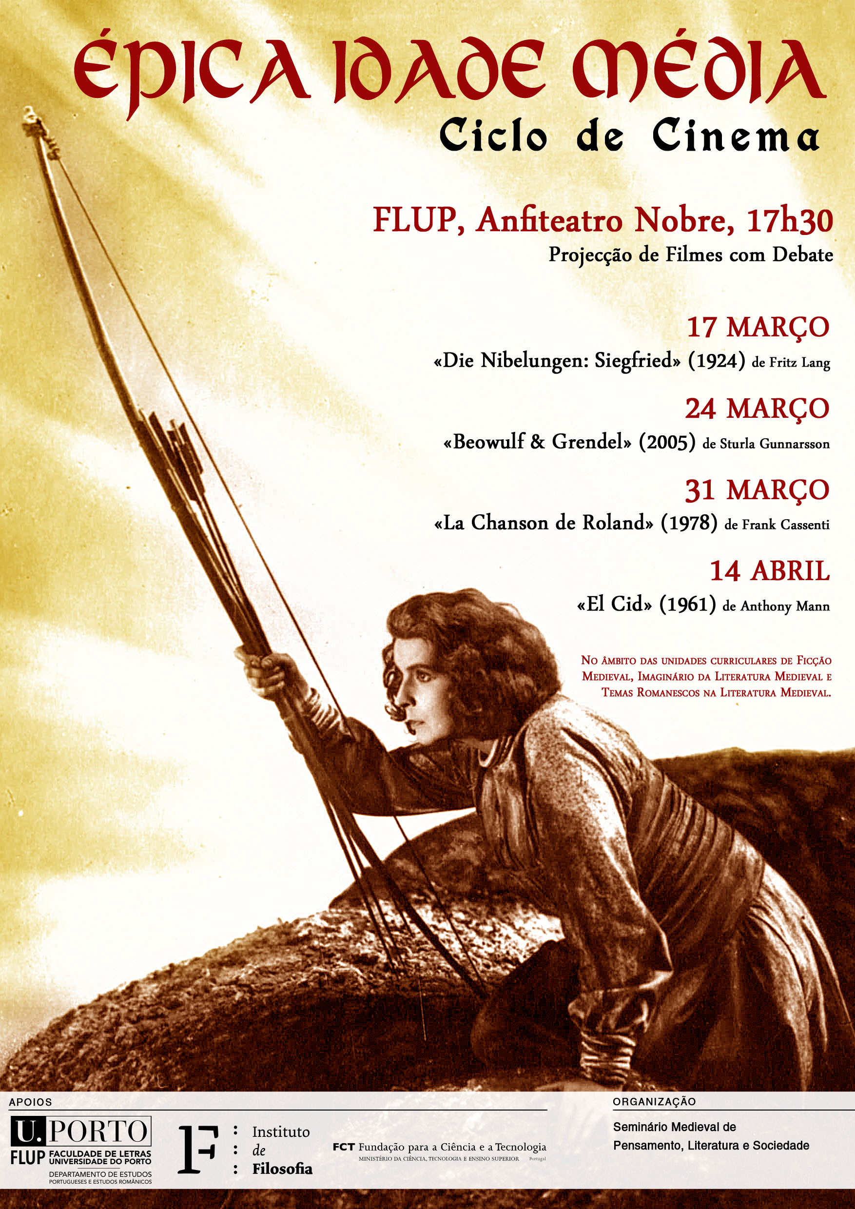 Com este ciclo, organizado no âmbito do Seminário Medieval de Literatura, Pensamento e Sociedade, pretendemos dar a conhecer a um público alargado algumas das mais importantes tradições épicas europeias, quer remontem aos tempos pré-cristãos e a heróis míticos como Beowulf e Siegfried, quer se fundem numa recriação de figuras históricas mais recentes como Carlos Magno, o seu sobrinho Roland ou Rodrigo Diaz de Bivar, o Cid.