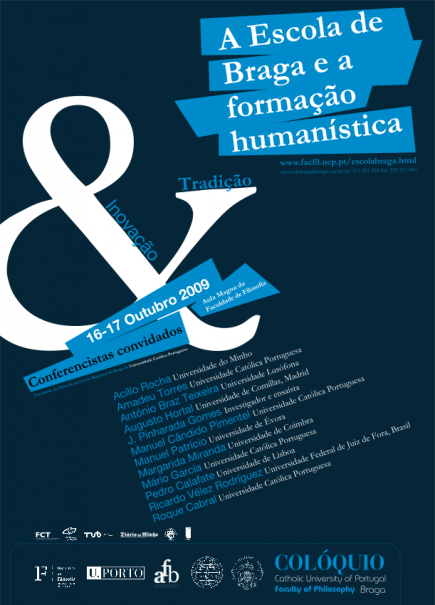 O grupo de investigação Roots and Horizons of Philosophy and Culture in Portugal do Instituto de Filosofia da Faculdade de Letras do Porto promove, juntamente com o Centro de Estudos Filosóficos e Humanísticos da Faculdade de Filosofia da UCP e com a Associação dos Antigos Alunos da Faculdade de Filosofia de Braga da UCP, o Colóquio intitulado A Escola de Braga e a Formação Humanística ? Tradição e Inovação, que irá decorrer nos dias 16 e 17 de Outubro na Faculdade de Filosofia do Centro Regional de Braga da Universidade Católica Portuguesa.
