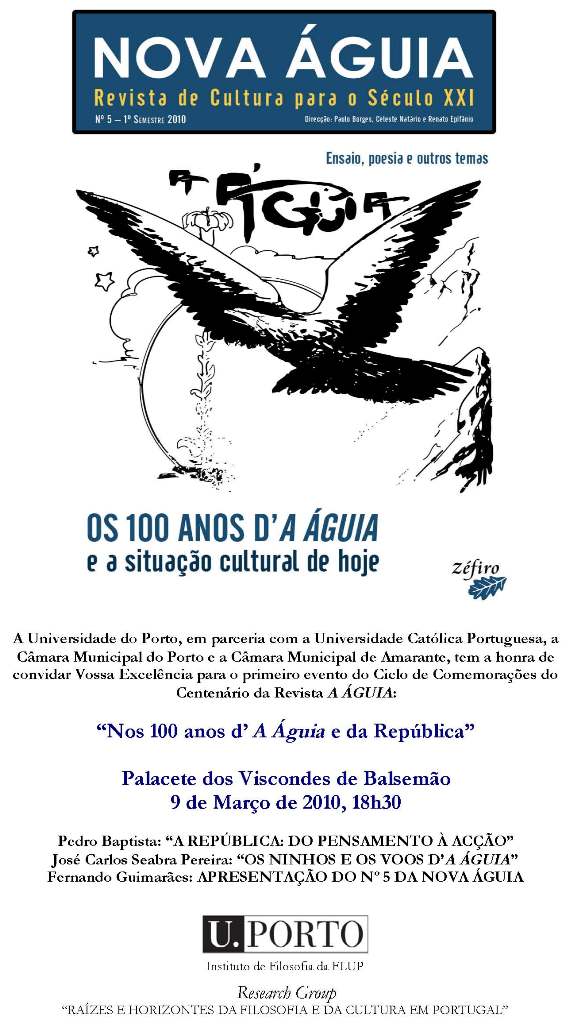 O Instituto de Filosofia da Faculdade de Letras da Universidade do Porto, em parceria com a Universidade Católica, a Câmara Municipal de Amarante e a Câmara Municipal do Porto convidam todos os interessados para o primeiro evento do Ciclo de Comemorações do Centenário da Revista A Águia: "Nos 100 anos d´ A Águia e da República".