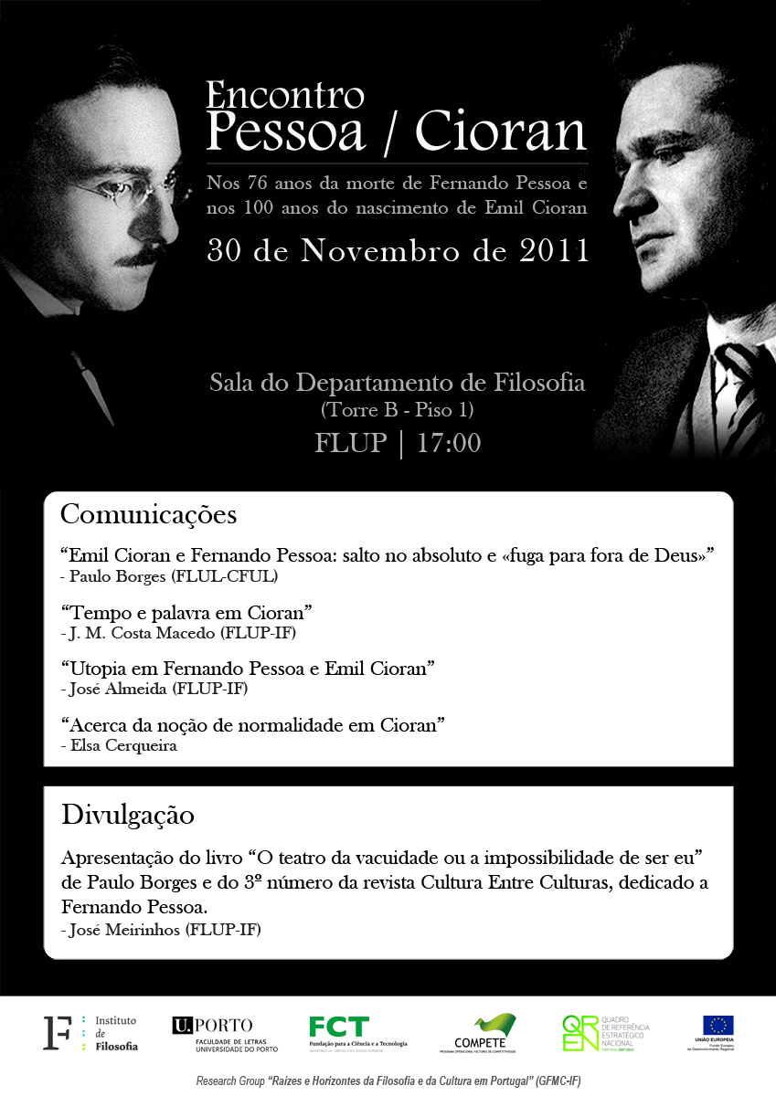 O Grupo de Investigação Raízes e Horizontes da Filosofia e da Cultura em Portugal do Instituto de Filosofia da Faculdade de Letras da Universidade do Porto tem o prazer de convidar todos os interessados para o Encontro Pessoa / Cioran - Nos 76 anos da morte de Fernando Pessoa e nos 100 anos do nascimento de Emil Cioran.